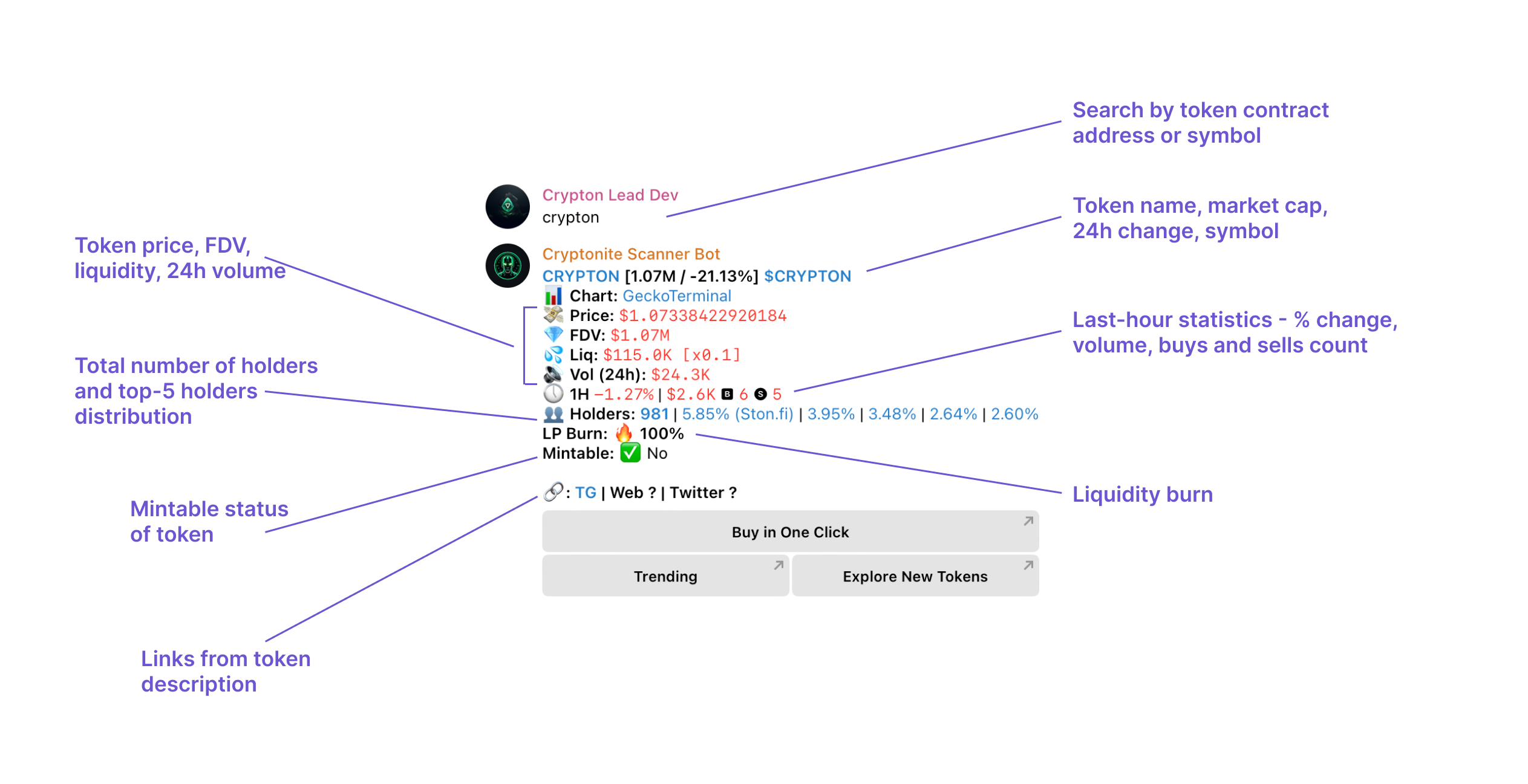[@CryptoniteScannerBot](https://t.me/CryptoniteScannerBot) can be used both in private conversations and groups. To scan a token, you can use its contract address or symbol for search.
